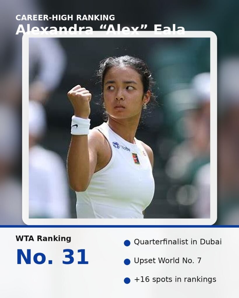 Alexandra “Alex” Eala has pushed her ranking to a new personal best after a breakthrough week in the Middle East. In the WTA rankings released Monday, Feb. 23, the 20-year-old Filipina climbed to No. 31, a career-high that came on the back of her quarterfinal run at the Dubai Tennis Championships.